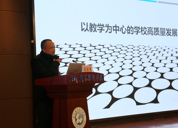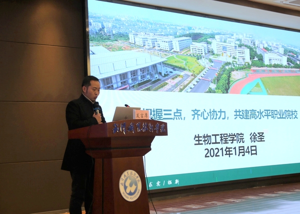 生物工程学院院长助理徐圣以《把握三点,齐心协力,共建高水平职业院校》为题,提出建高水平职业院校要找好出发点、找对发力点、找准突破点。徐圣认为,学校要明确自身“从教育而来,到职业(社会)中去”的定位,谋划专业发展,做好专业布局、专业生态链构建、专业群定位;各二级学院要主攻教师、教材、教法“三教”改革。他提出,在专业布局上,要充分评估国情、省情、市情、校情,做强重点专业、做大特色专业、做优新兴专业;在专业生态链构建上,要集成发展五大类主动脉专业、错位发展三类次动脉专业群,实现专业生态链创新融合发展;在专业群的定位上,要采取“狼群战术”错位发展、分层对标;在学校办学治校上,要通过文化办学办出高度、通过管理办学办出力度、通过幸福办学办出温度。