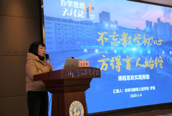 纺织与服装工程学院教师罗莹以《不忘教学初心 方得育人始终——课程思政实践探索》为题作交流发言,分享了自己在包装策划与设计专业课教学中践行课程思政的做法和体会。罗莹着重介绍了自己课程思政建设的“四部曲”,即:挖掘——基于课程目标与学科属性,挖掘思政元素;重构——基于课程内容,专业内容与思政元素深度融合;再造——基于一致性构建原则,反向设计,正向实施;创建——讨论情景,多元化考核,逐步达到思政目标。通过课程思政实践探索,罗莹取得了系列实践成果:通过对学生进行多元考核,厚植了爱国爱家情怀;通过融入传统文化,增强了文化自信和民族自豪感;通过培养学生创新创业,增强了学生职业意识;通过以赛促教,激发了学生学习兴趣。