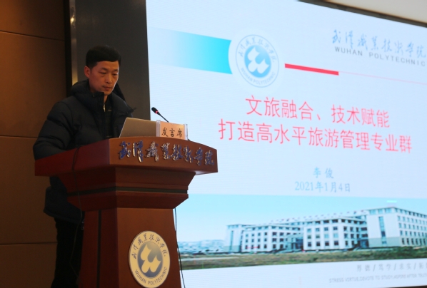 旅游与航空服务学院院长李俊以《文旅融合、技术赋能 打造高水平旅游管理专业群》为题进行了分享。李俊指出,学校在发展过程中,要充分认清形势、充分认识自身发展的优势和短板,提前谋划、及早部署。李俊提出,学校旅游专业的发展理念是“文旅融合、技术赋能”,要坚持中国特色社会主义职业教育发展新理念,全面落实立德树人根本任务,立足湖北,辐射长江经济带,围绕湖北省全域旅游发展战略,建设中国特色高水平旅游管理专业群,将“武职旅游”打造成为引领湖北、领先全国的职业教育知名品牌和高素质旅游技术技能人才培养高地。李俊提出了旅游与航空服务学院未来发展的计划,一是创新专业群人才培养模式,二是深化产教融合、校企合作,三是加快“三教改革”、实施课堂革命,四是推动教师分类管理、打造“三师”型教师团队,五是技术赋能人才培养与社会服务,六是促进国际交流与合作转型升级。