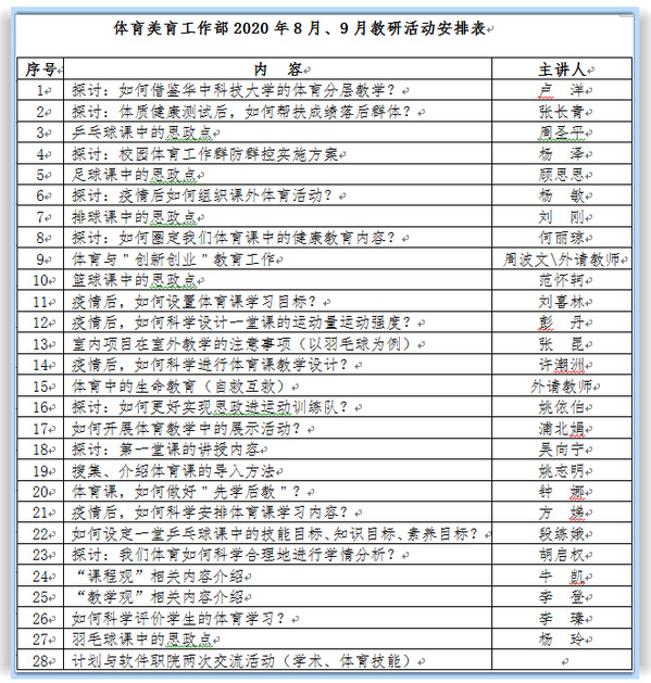 发展学校体育事业的基础在于整体提升教师教育教学教研能力,从2020年8月29日至9月29日,体育美育部共组织开展了28次专题教学能力提升系列培训。培训内容涵盖疫情常态下体育教学、群体活动如何开展、体育创新创业教育的开展、体质测试成绩提升方法、急救知识学习五大方面。