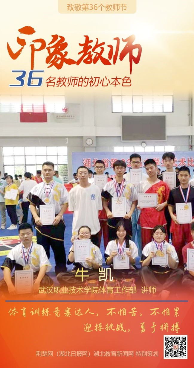 牛凯是武汉职业技术学院体育工作部体育教师,中共党员,所带训练队获2019年湖北省大学生武术比赛男团第一名、女团第二名、男女混合团体第一名、集体项目第一名,2018年湖北省运动会大学生武术比赛男团第一名、女团第二名。