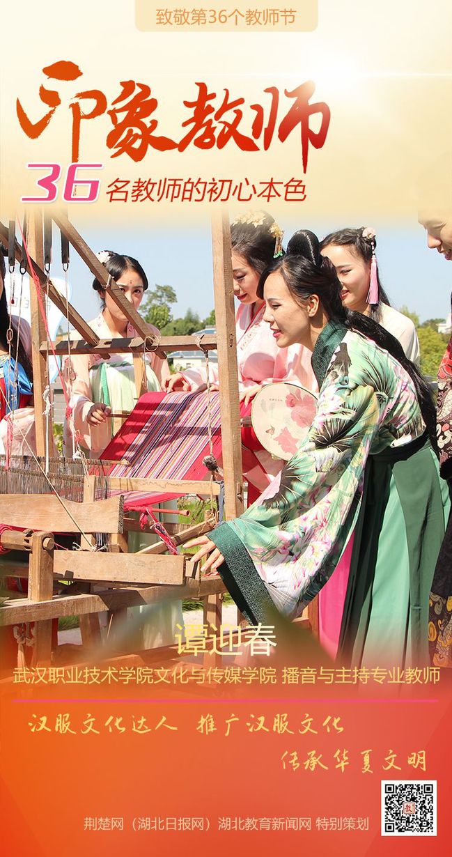 武汉职业技术学院文化与传媒学院党委书记、院长吴跃平谈到谭老师,他用了“首个”这个词来形容,“谭老师为了让学生不忘民族传统、传承其中精髓,在全国首开户外体验式汉服文化课程。”