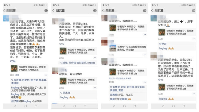 武职人购买的椪柑,是宋林林家的。宋林林是武汉职业技术学院旅游与航空服务学院2019级的学生,2020年7月,他的父亲因病离世,留给他和母亲8万多元的外债,这让宋林林感觉前路一片黑暗。