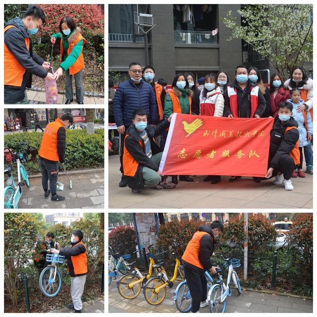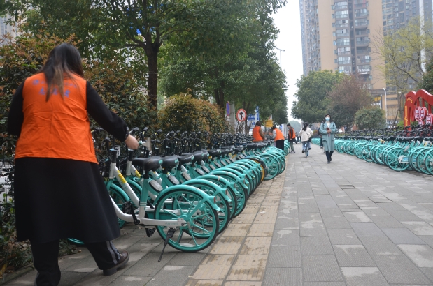 经过简短的分工,电子信息工程学院分党委副书记代春兰带领10余名志愿者,一手拿镊子,一手拿垃圾袋,在社区内广场、街道、绿化带捡拾各类垃圾、拉网式清理卫生死角。分团委书记刘召富则带着一小队志愿者,在社区内外主要道路上整理随意停放的共享单车。