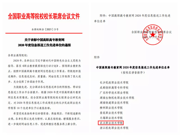 武职网讯(党委宣传部 陈峰) 近日,全国职业高等院校校长联席会议发布《关于表彰中国高职高专教育网2020年度信息报送工作先进单位的通报》〔2021〕3号文件,武汉职业技术学院获评“中国高职高专教育网2020年度信息报送工作先进单位”,成为10所受到表彰的职业高等院校之一。