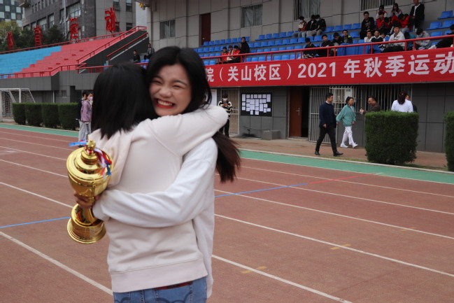“关山校区团体总分第一名,旅游与航空服务学院!”武职关山校区运动场上,空乘19304班程丽文在领奖台上接过奖杯,朝陈玲玲老师飞奔过来,她扑进陈老师怀里,靠着陈老师肩膀上笑了哭、哭了笑,数度哽咽,师生们簇拥在一起,欢呼着、跳跃着,几次湿了眼框。