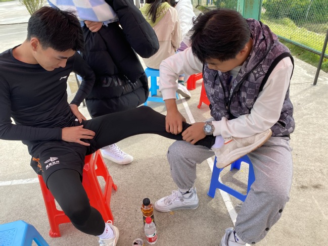 旅管20202班热思汉100米预算后小腿拉伤,老师让他放弃决赛,但他休息片刻后依然全力以赴走上赛场,“绝不弃赛!走也要走完全程。”