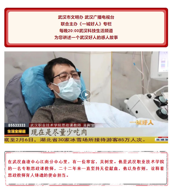 对无偿献血的全力支持,在吴树堂这里还有着更深远的意义。吴树堂的本职工作,是武汉职业技术学院的一名专职思政课教师,育人铸魂,立德树人,最重要的就是躬身力行。