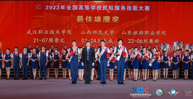 近日,由中国高等教育学会主办的2022年中国高等教育博览会产教融合系列活动在陕西西安完美收官。由34名空乘学子组成的武汉职业技术学院斩获2022年度高等学校民航服务技能大赛团体综合亚军、2022年度高等学校航空类专业就业工作先进单位等集体荣誉,空中乘务专业2021级学生周晋文荣获“最佳雄鹰奖”,孙正琦荣获第一届“金通杯”主持人大赛新锐主持奖,曹灿、徐明选、魏翔宇、周晋文荣获“象大使”形称号。