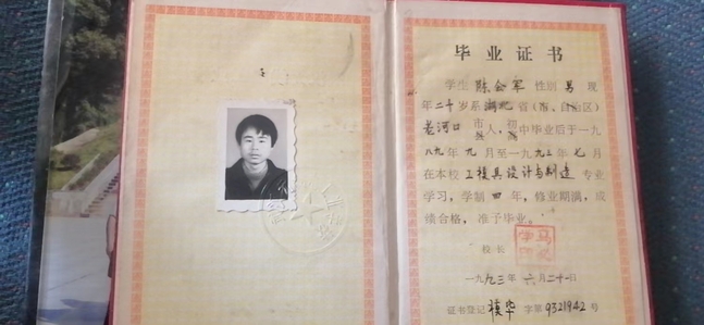 “1989年,父亲陈会军初中毕业,并以优异的成绩考入原武汉无线电工业学校模具专业89219班。父亲当年15岁,独自背着行囊,从老家老河口坐上前往武汉的客车,踏上了漫漫求学路。”