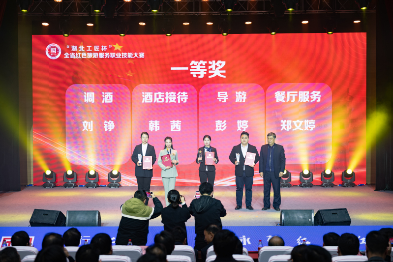 彭婷(左二)荣获“湖北工匠杯”全省红色旅游服务职业技能大赛导游赛项一等奖