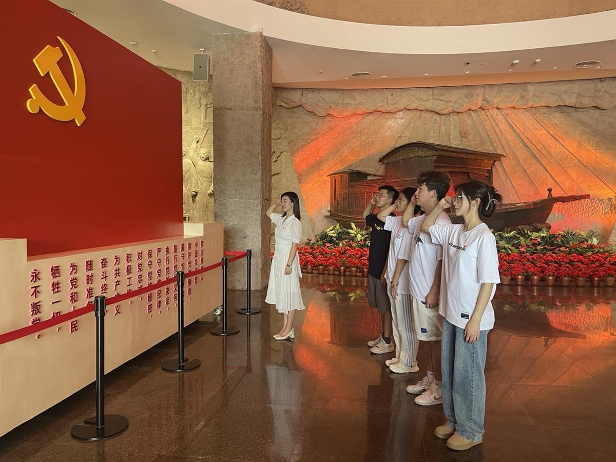 南湖之畔,秀水泱泱;湖心岛上,红船闪闪。在嘉兴南湖,大家登上湖心岛,驻足瞻仰红船,聆听“一条小船和一个大党的故事”,感悟革命征程中的“大浪淘沙”。一艘画舫承载千钧,唤醒了神州,开启了中国共产党的伟大远航。在南湖革命纪念馆里,一件件饱经风雨沧桑的珍贵文物,一张张定格历史的史料照片,一幕幕厚重而生动的影像,把大家带回那个“开天辟地,敢为人先”的峥嵘岁月。大家认真聆听,不时用手机记录难忘时刻。