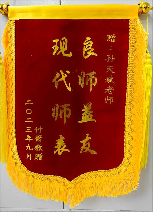 取回快递件,反复核对收件人信息,她才小心翼翼拆开长方形快递盒,发现鲜红色的绒布和金黄的流苏。她满腹疑惑地展开整个物件,看到是一面锦旗,写有“良师益友 现代师表”,署名付**同学。 “原来是他啊!”孙老师微笑着轻声自语。