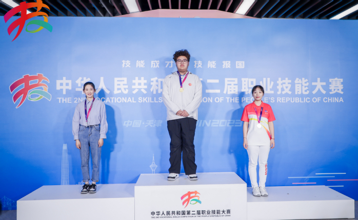 武汉职业技术学院2023届毕业生李儒锋(中)获中华人民共和国第二届职业技能大赛时装技术赛项金牌