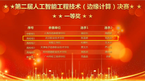 12月11日,2023年一带一路暨金砖国家技能发展与技术创新大赛——第二届人工智能工程技术(边缘计算)赛项决赛成绩揭晓,武汉职业技术学院代表队陈蓝娜、刘志成团队勇夺全国一等奖,并以总分第一的成绩晋级国际赛,李启瑞、刘博论团队获全国三等奖,武汉职业技术学院获“最佳组织奖”。