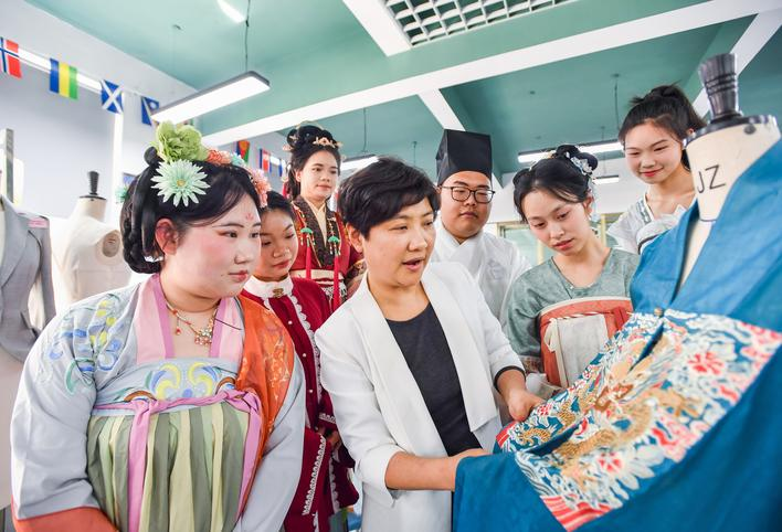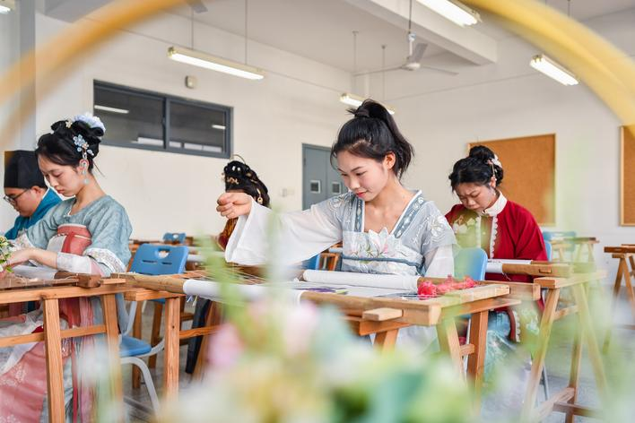 就读于该校纺织与服装工程学院服装与服饰设计专业的付美琳,刚刚接触汉服的设计制作,心里已经开始设想,能穿上自己裁剪的华裳,去约会春天。