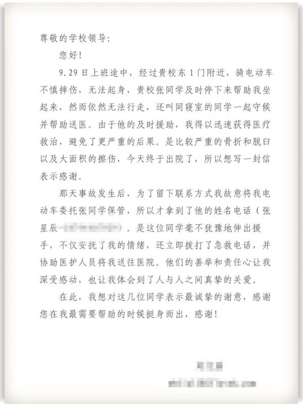 伤者康复出院后,特地给学校写来感谢信。信中写道:“是张星晨同学的及时救助,让我在受伤后第一时间得到了关心与帮助,避免了更严重的后果……他的善举和责任心让我深受感动,看到了新时代大学生的勇敢与善良,也让我体会到了人与人之间真挚的关爱。”