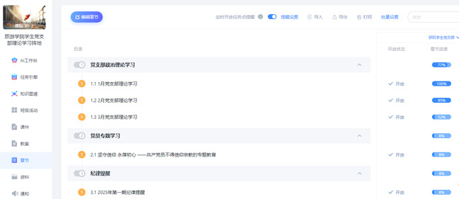 “这每月任务提醒比我闹钟还准时,太贴心啦!”正在北京大兴机场实习的学生预备党员陈有忍不住点赞。为帮助分散在各地的校外实习党员解决学习难的问题,骄阳学堂把理论教育搬到了“智慧云阵地”,还嵌入了 “政治理论学习”模块和 AI 学情分析系统。