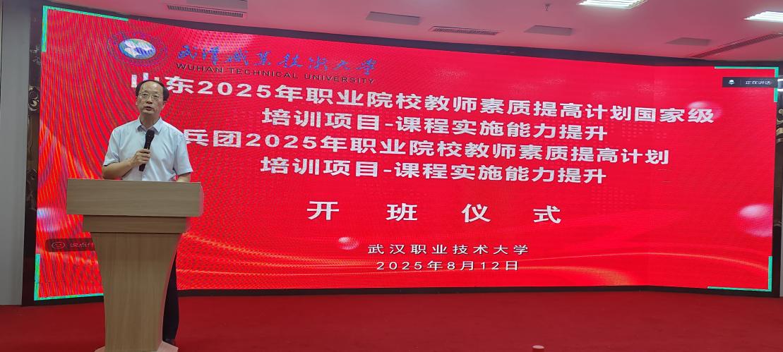 8月12日上午,培训班开班仪式举行。武汉职业技术大学副校长杨旭东代表学校致欢迎辞,介绍学校发展历程、办学特色与教学改革成效,勉励学员珍惜机会、学以致用,为兵团职业教育高质量发展注入新动能。兵团领队王亚评老与学员代表分别作表态发言,承诺严守纪律、积极参训。