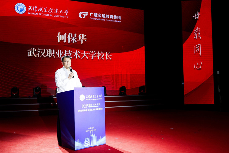 武汉职业技术大学校长何保华发表致辞。他回顾了学校与广慧金通教育集团二十年来的深度合作历程,从专业共建到师资共培,从课程改革到国际合作,双方始终携手同行、共谋发展。何保华指出,校企合作不仅拓宽了人才培养的广度,更提升了民航职业教育的高度。二十年的历程,是办学理念的不断升华,更是教育情怀的持续坚守。未来,武汉职业技术大学将继续以开放的姿态、创新的理念,深化产教融合、校企协同,为民航强国战略培养更多德技并修、知行合一的时代英才。