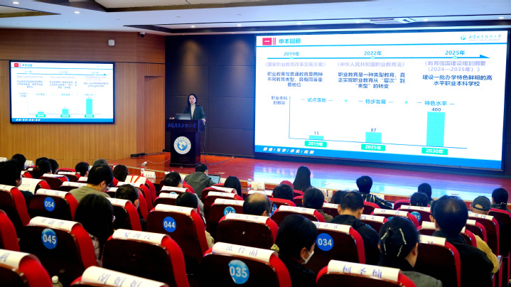 武汉职业技术大学智能商务学院院长周蓉以“类型教育背景下电子商务职业本科专业高质量发展思考”为题,解读了职业本科专业设置的核心条件,同时结合电子商务专业升本实践,分享了职业本科专业实现高质量发展的路径思考,为同类院校提供了有益借鉴。
