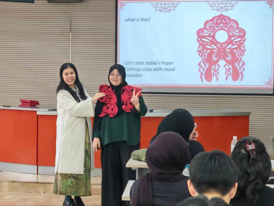 新加坡义安理工学院学生体验植绒布“云肩”剪纸作品