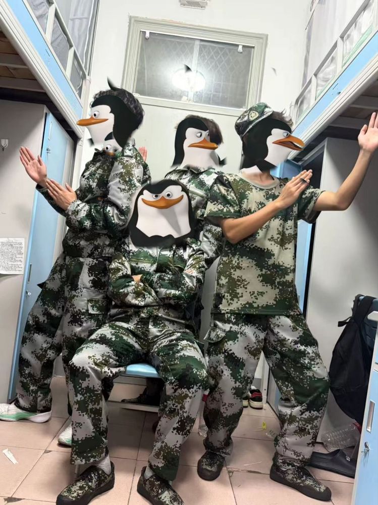 周围的“新兵”火速围坐成圈“观训”,眼里没有嘲笑,只有憋不住的笑意和满满的鼓励。有人用眼神疯狂打call,有人偷偷比出加油手势,这哪里是受罚,分明是一场超有爱的青春“匍匐接力”。迷彩服的绿、场地的蓝,再加上大家藏不住的笑脸,把这段“罚并快乐着”的时光,变成了军训里独一份的甜。