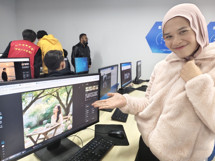 留学生们踊跃上传个人照片作为创作参考,生成了一批风格各异的数字形象。来自越南的杨氏玉英说:“我曾尝试过类似功能,但今天体验的AI工具更先进,生成效果远超预期。”印度尼西亚的蕊尔分享道:“操作流程简洁清晰,不难理解,而且生成的图片质量很高。”哈萨克斯坦的世豪则展示了他的职业风格数字形象:“这个形象既像我,又充满科技感,非常适合用在正式文档中。”