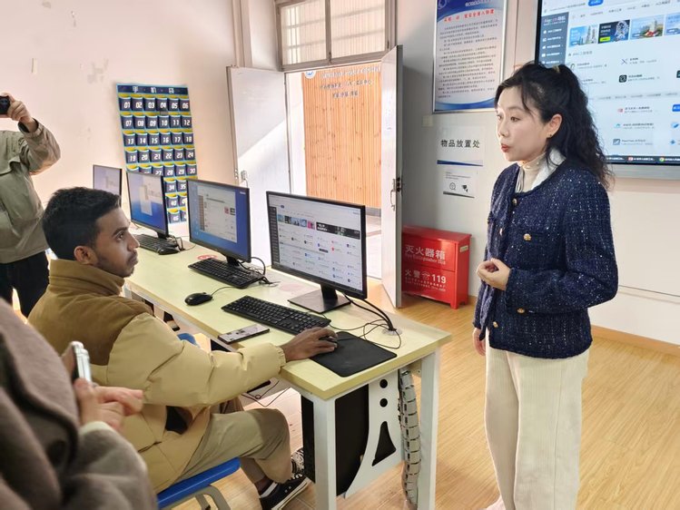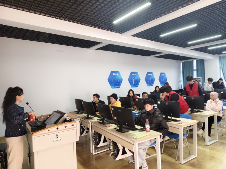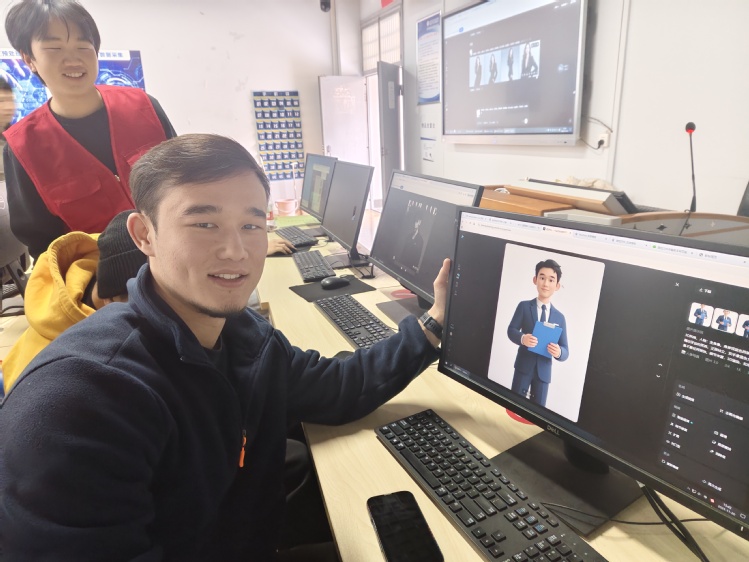实践环节中,留学生们在陈觎的引领下,同步操作电脑,借助豆包AI与即梦AI平台,先后生成中国古代诗人形象与个人虚拟分身。教室内学习氛围浓厚,不少留学生主动举手请教,探讨如何优化提示词以提升画面质感。陈觎和人工智能学院(信创产业学院)学生志愿者穿梭于各小组之间,细致解答操作难题,指导全部留学生顺利完成专属创意作品。