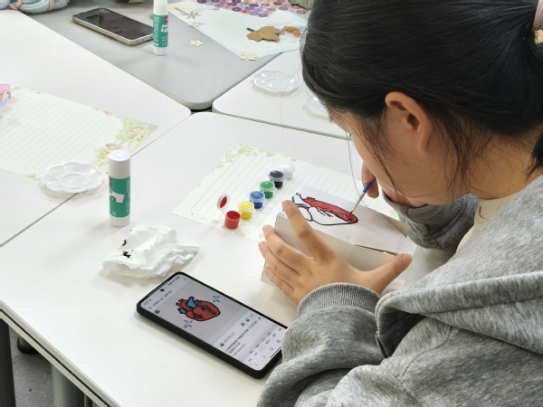 11月21日中午,凌曦楼 C3001 教室摇身一变成为“韧性赋能工坊”。学子们化身“情绪设计师”,在舒缓的音乐中沉浸式开展情绪收纳盒创作。彩纸拼贴、图案绘制、瞬间拍照记录,高数焦虑、小组协作烦恼等各类压力与困扰,都被“收纳”进亲手制作的盒子里。