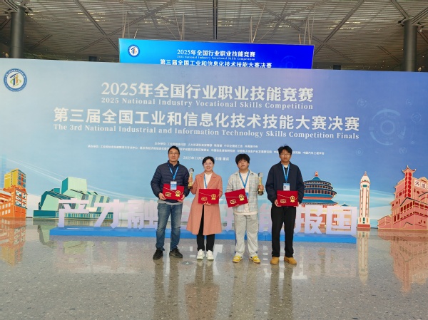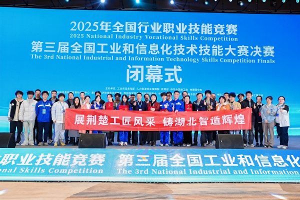 新闻网讯(通讯员谢真真)11月28日,第三届全国工业和信息化技术技能大赛全国总决赛在重庆落幕。武汉职业技术大学光电与信息学院教师谢真真、杨雁冰,学生郭焱坤、张小波凭借精湛技艺与默契协作,在 RISC-V等架构芯片开发与系统应用赛项中脱颖而出,一举斩获职工组、学生组两项全国二等奖,彰显了学校集成电路人才培养成效。闭幕式上,参赛师生与湖北代表团共同簇拥“展荆楚工匠风采 铸湖北智造辉煌”横幅,手捧奖杯证书定格荣耀瞬间。