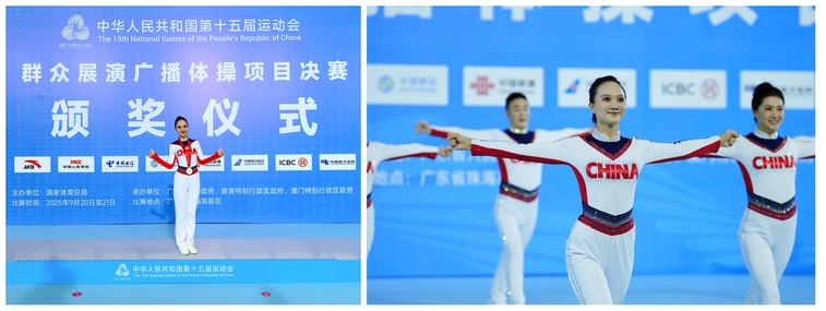 教师付勤则代表湖北队参与群众展演广播体操项目决赛,她以规范标准的动作、饱满昂扬的精神状态完成全程展演,动作舒展有力、神情专注投入,助力湖北队荣获该项目二等奖,展现了湖北省群众体育的深厚底蕴。“广播体操是全民健身的重要载体,能在全运会舞台上展现群众体育的活力,为团队争光,让我更加坚定了推广科学健身、助力全民健康的信念。”付勤分享了自己的参赛感受。