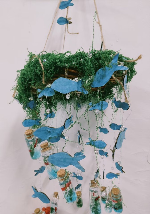 建筑工程学院彭博颖凭借作品《清风》获得一等奖,作品利用快递纸盒、闲置玻璃瓶、柳枝等制作为风铃,警示人们拒腐防变要从拒绝“快递”形式礼品礼金做起。