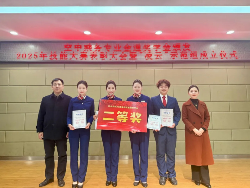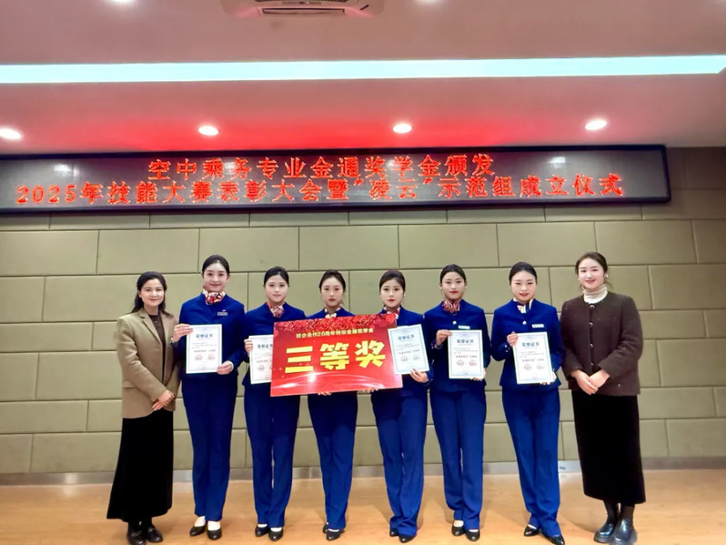 大会核心环节是对优秀学子的集中表彰,展现“以赛促教、以赛促学”的改革成效。大会颁发校企合作二十周年特设的“金通”奖学金。该奖项体系完备,涵盖“旅学”(学业卓越)、“旅技”(技能精湛)、“旅志”(志趣高远)、“旅艺”(才艺突出)、“旅星”(服务新星)五大单项奖及综合奖,鼓励学生全面发展。经严格评审,吴浪、王童林等32名品学兼优的空乘学子脱颖而出。其中,一等奖学金3000 元,二等奖学金2000元,三等奖学金1000元,单项奖学金500元。这套多元评价体系打破唯分数的传统模式,是对学生综合职业素养的立体化认可。