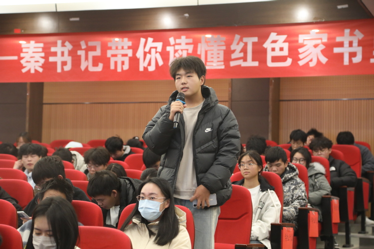 秦秋平还分享了家庭传承的温暖故事。从小听着父亲的革命故事长大,即便家境拮据——“一年养大一头猪仅卖200多元”,家人仍坚守“助人向善”家风。父亲的资金支持、母亲的默默操劳,成为他攻坚克难的坚强后盾。“家风是最好的传承,红色家书是最珍贵的遗产!”他饱含深情地讲述,让现场师生深受触动。