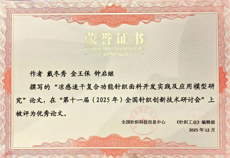 新闻网讯(通讯员吴茜)近日,由全国针织科技信息中心与北大核心期刊《针织工业》联合主办的“第十一届(2025 年)全国针织创新技术研讨会”在上海召开。期间,武汉职业技术大学戴冬秀团队依托企业横向项目研发的科研论文《凉感速干复合功能针织面料开发实践及应用模型研究》表现亮眼,经行业权威专家评审,荣获“优秀论文奖”。