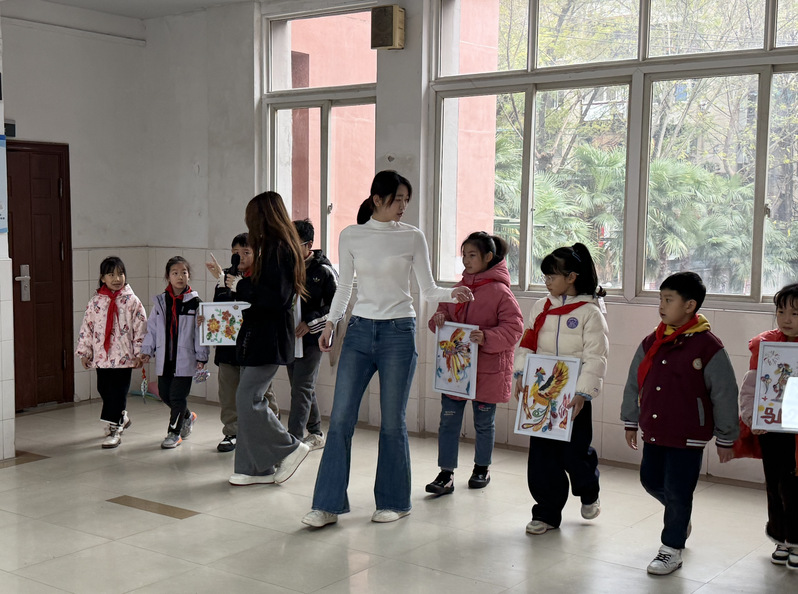 这场名为“锡三少年,衣起闪耀”的走秀,是江岸团区委、区教育局“朋辈相伴 青春同行”志愿服务项目的生动实践。时尚与传媒学院党员教师杜恒、曹欣悦带领时尚表演与传播专业学生徐美昊、李奇隆、张梓轩、胡湘格,以“朋辈辅导员”身份进校园,将专业走秀指导与小学生美术创作结合起来,打造了一堂从创作到展示的完整美育课。