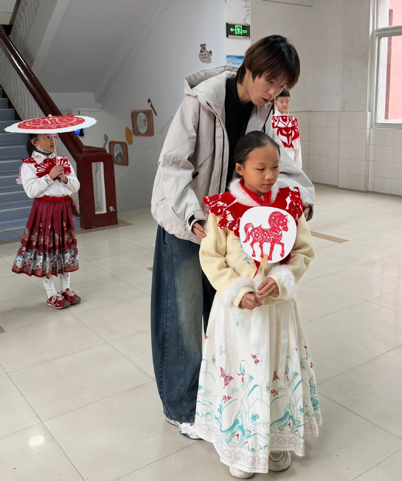 这种“双重展示”的设计,既尊重了孩子们的劳动成果,更以“大带小”的陪伴模式激发了他们的自豪感。活动中,孩子们掌握了基础走秀技巧,同时在设计、制作、展示的全过程中真切体会到艺术表达的乐趣。