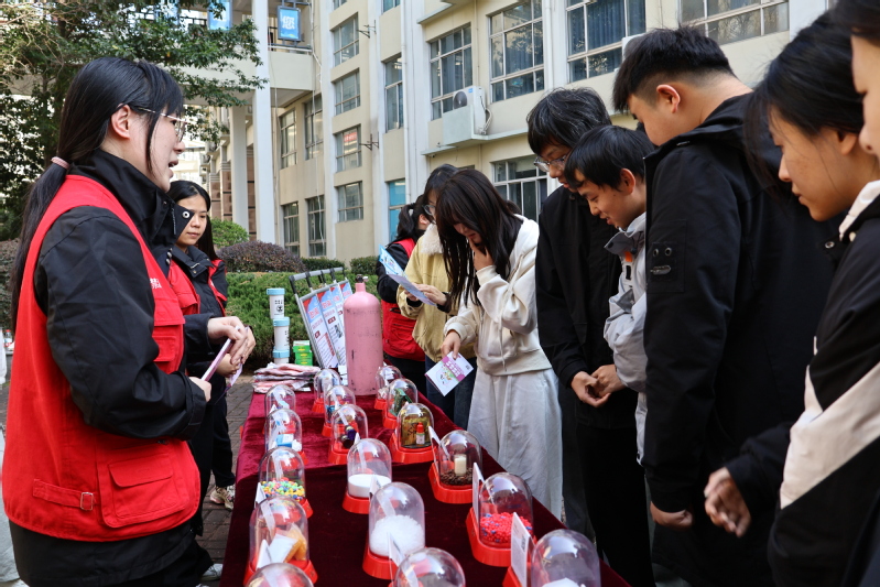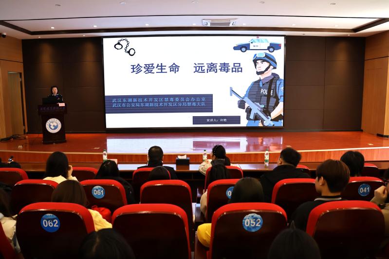 当天下午,武汉市公安局东湖新技术开发区分局禁毒大队应邀走进校园,警官许艳为师生带来一场题为《珍爱生命远离毒品》的禁毒专题讲座。讲座结合真实案例,通过图文展示、视频播放、仿真毒品模型讲解等形式,系统介绍了常见毒品的种类、特征及其对个人身心健康、家庭幸福和社会稳定的毁灭性危害。她特别针对当前新型毒品伪装性强、迷惑性大的特点,传授识毒、防毒、拒毒的实用技巧,引导学生提高警惕、远离高危场所、谨慎交友。