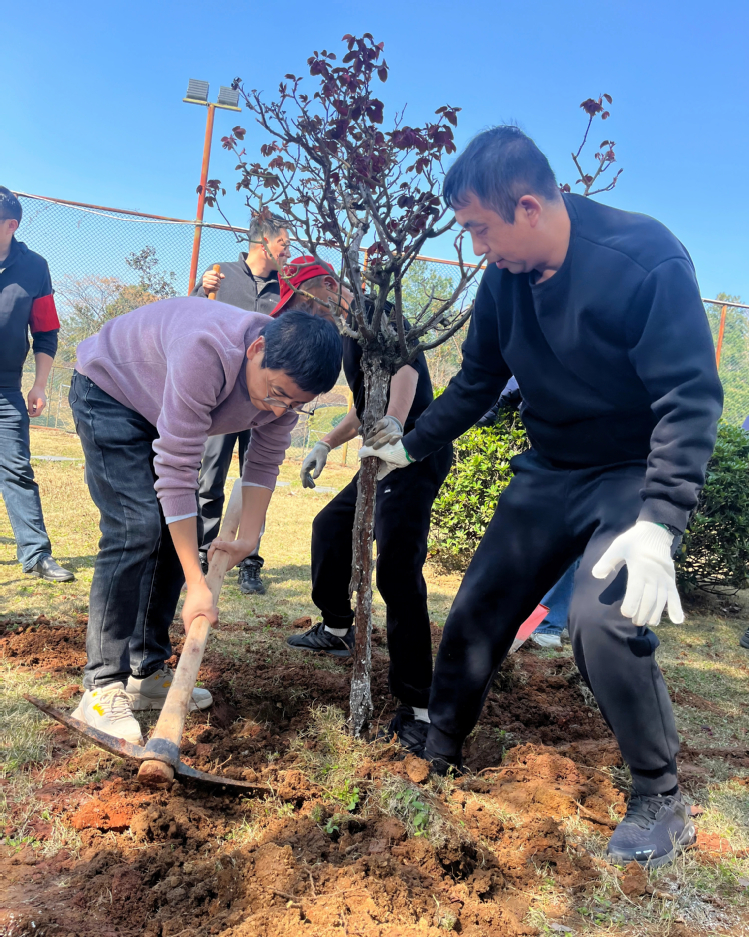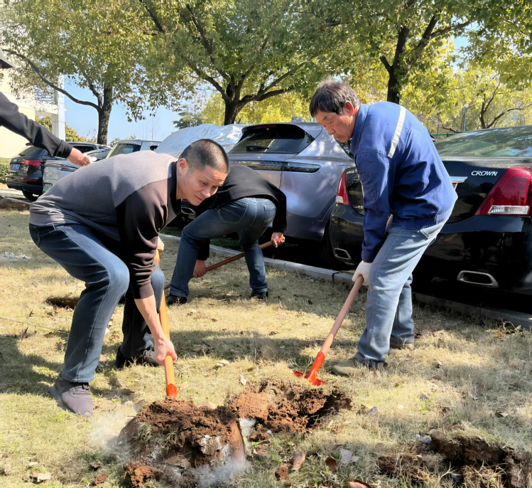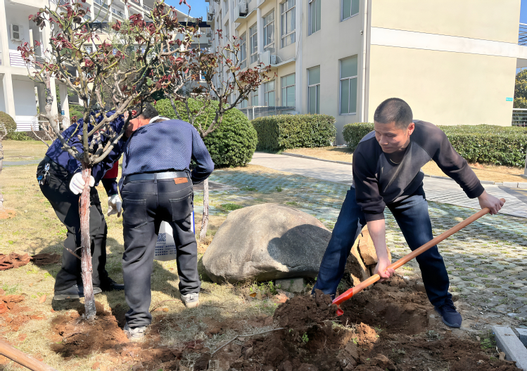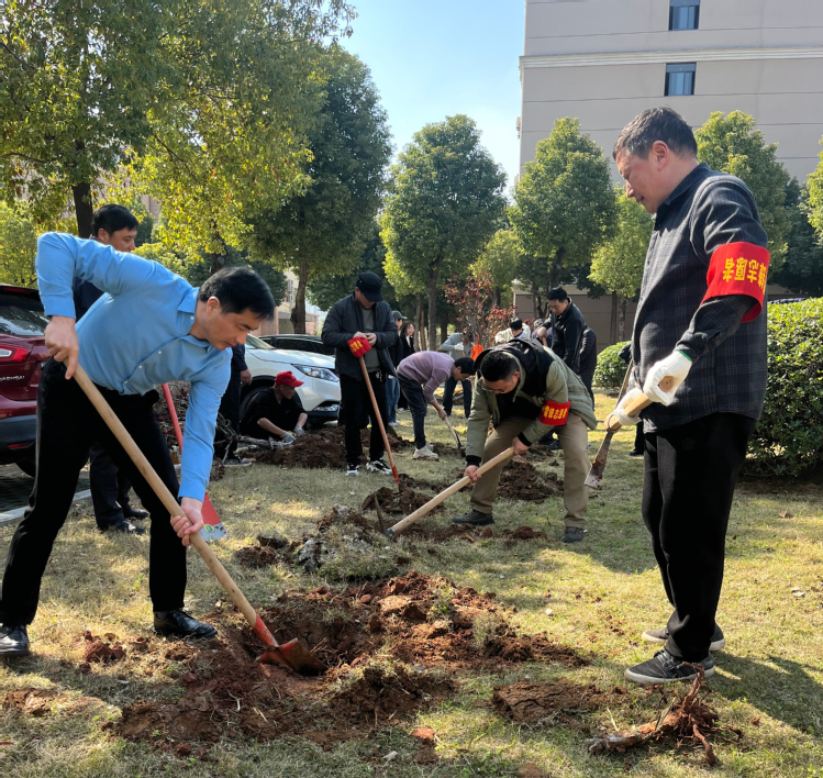 春日暖阳下,活动现场一派繁忙景象。党员们热情饱满、干劲十足,迅速分工协作,挖坑、扶苗、培土、浇水,每一个环节都有条不紊、配合默契,指尖沾泥、额角挂汗,用实干为春日校园增添新绿,现场欢声笑语与劳动的身影相映成趣。