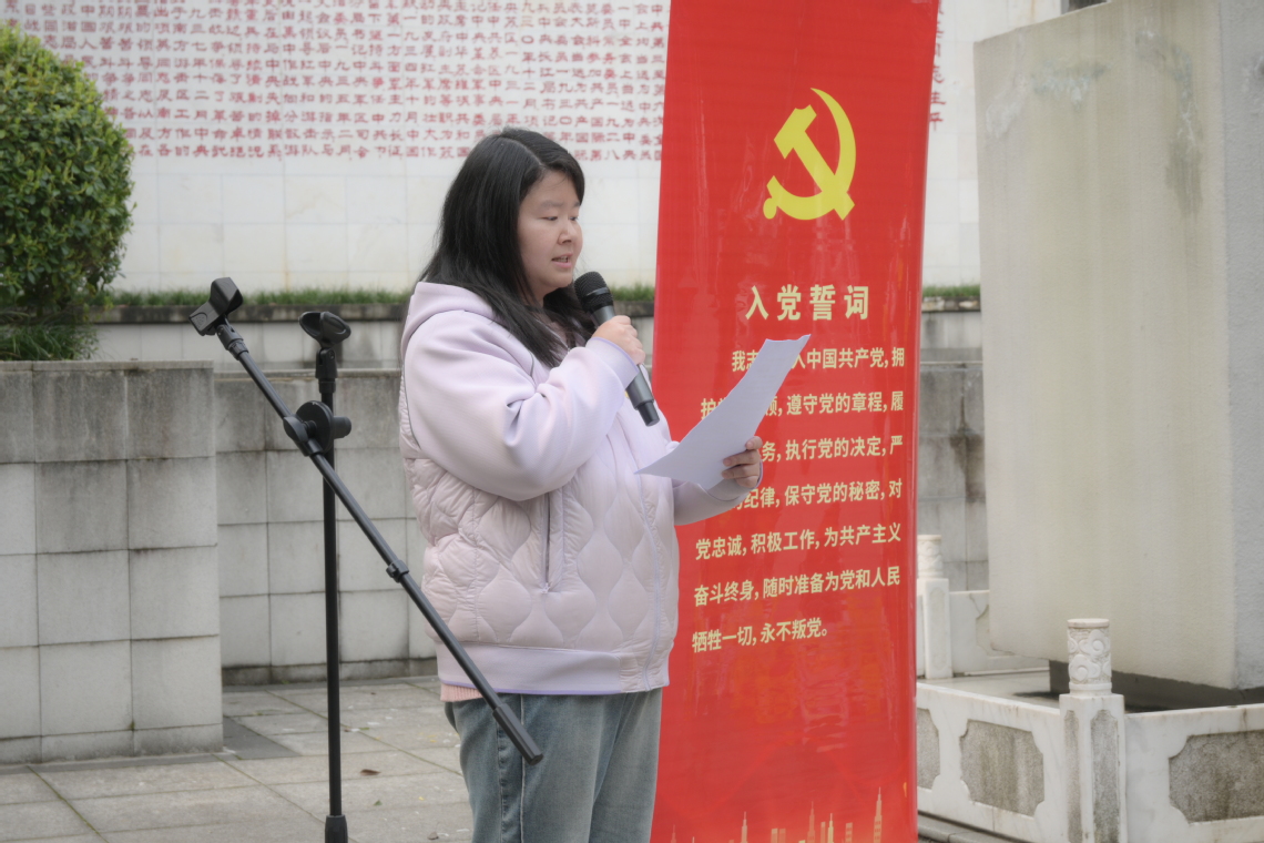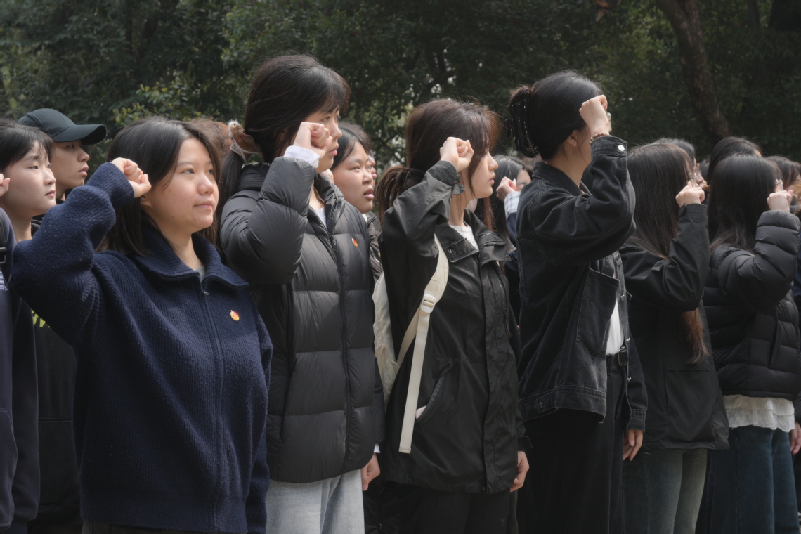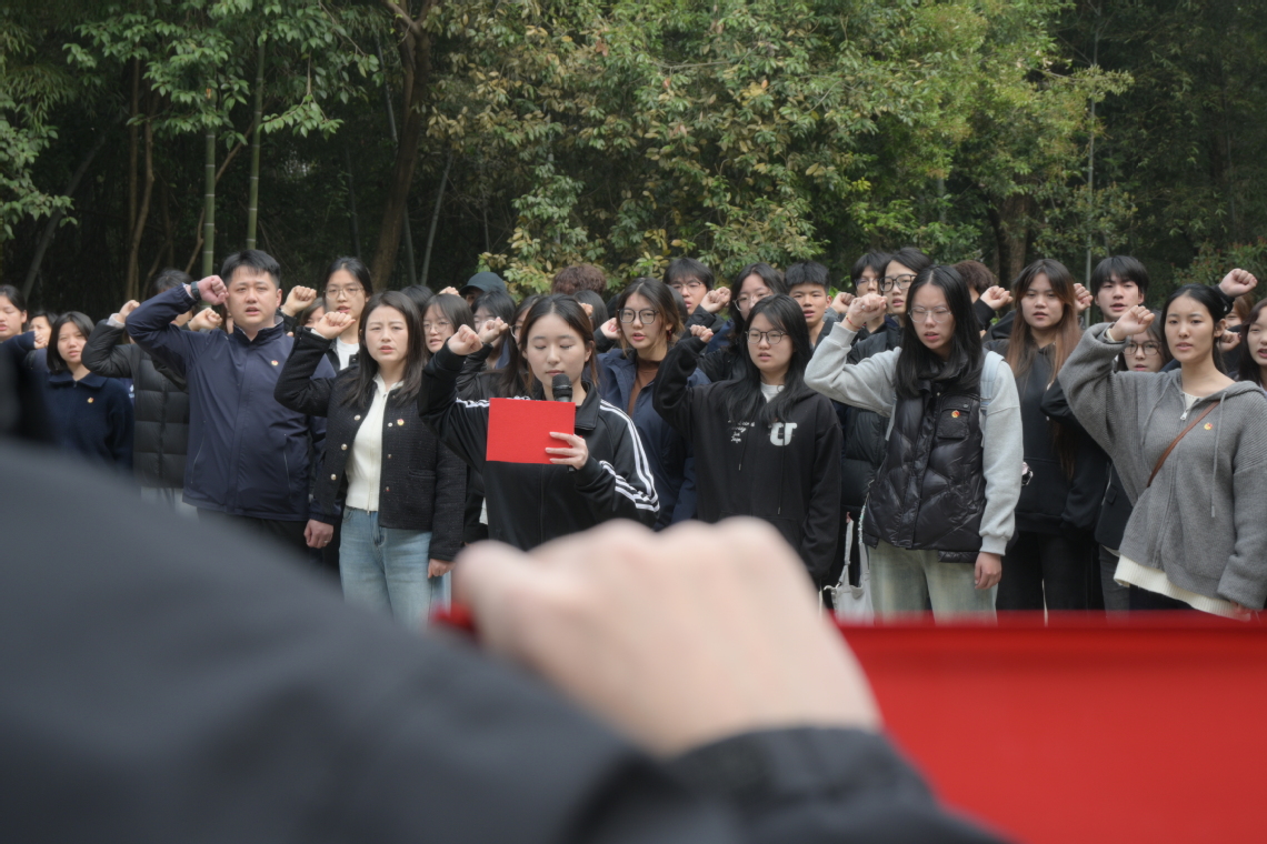 铿锵有力的誓言先后响起,领誓人分别是学院人工智能学生党支部副书记陈芷涵与学院分团委学生副书记李思彤。当最后一个音节缓缓落下,全场陷入短暂而庄重的肃静,仿佛连山风都停下了脚步,聆听这份穿越时空的承诺,感受两代人血脉相连的信仰传承。