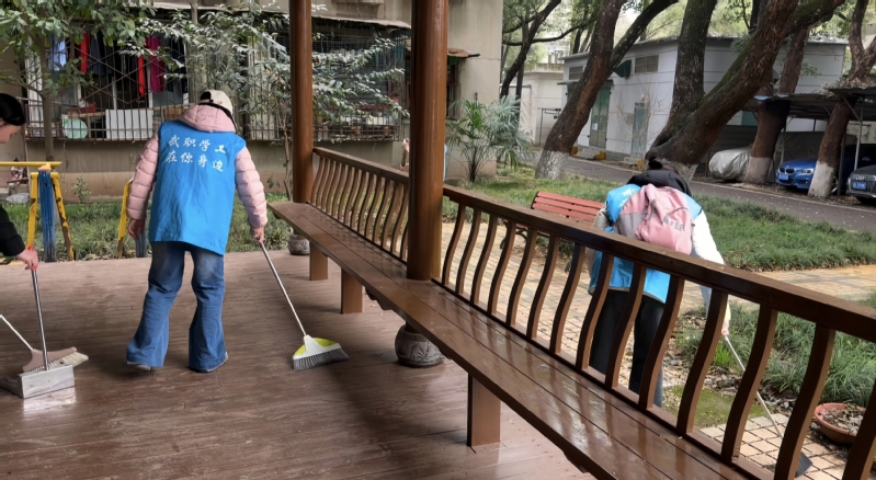学院各班组建志愿队伍,先后走进洪山区关山街道武职社区、卓刀泉街道体院社区开展便民实践活动。在社区里,志愿服务队员们分工协作,专人清理楼道违规小广告,有人捡拾绿化带里的纸屑,有细心的女生清理花坛绿植夹缝中的稀碎废弃物。志愿者们化身环境美化使者,用辛勤付出整治社区卫生死角,让居住环境变得整洁靓丽。