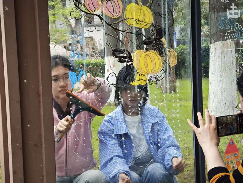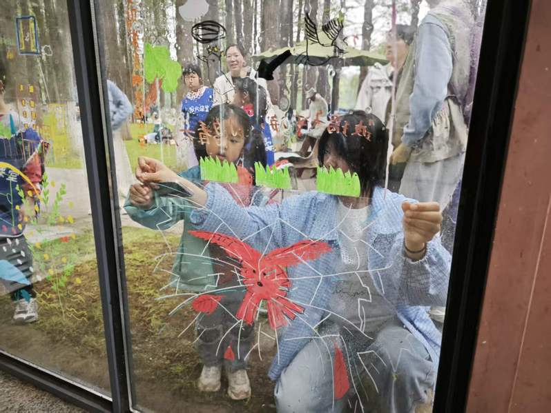 活动进入最关键的实地张贴环节,团队成员协助亲子家庭将手绘贴纸科学张贴于公园玻璃建筑上,为鸟类筑起安全屏障,有效降低“鸟撞”风险。