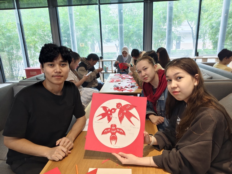 哈萨克斯坦留学生王奕雄与另外两位留学生组成“燕子小家庭”,分别剪出燕爸爸、燕妈妈和燕宝宝,收获老师的连连称赞。王奕雄还分享了家乡的传说:燕子为救雏儿与恶龙搏斗,燕尾因此分叉。这一意象与中华文化中燕子象征吉祥、幸运的寓意完美契合,中外文化在小小剪纸间达成了深沉共鸣。