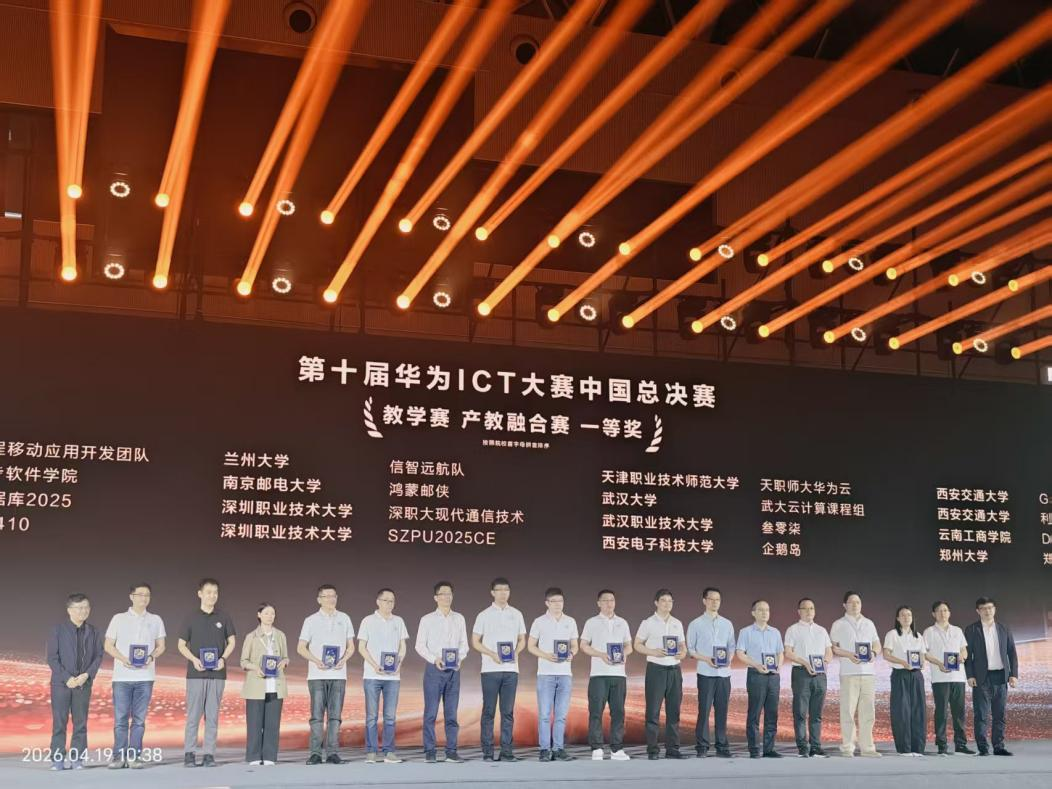 新闻网讯(通讯员 肖渝琪)4月19日,第十届华为ICT大赛中国区总决赛圆满落幕。武汉职业技术大学人工智能学院(信创产业学院)师生在大赛中表现优异,荣获全国一等奖 2项、二等奖2 项,实现师资教学能力与人才培养质量双丰收。